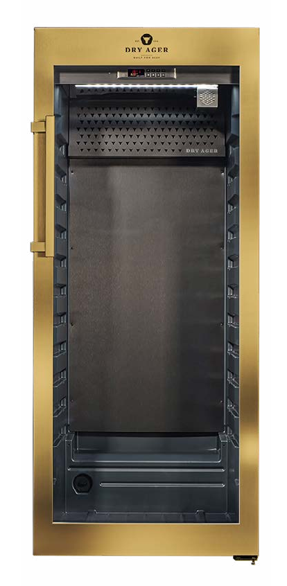 За защита на месото от вредна UV светлина, елегантната рамка от неръждаема стомана, която държи изолиращата врата на DRY AGER®, е метализирана.